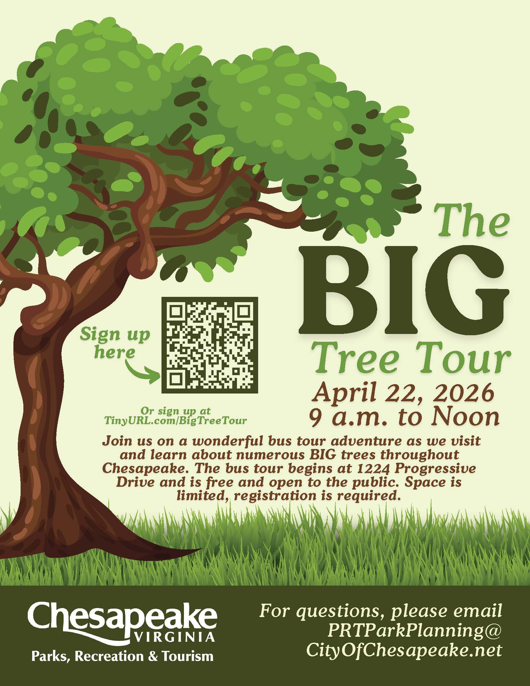 Join Chesapeake Parks, Recreation, and Tourism for a wonderful bus tour adventure to visit and learn about BIG trees throughout Chesapeake. Space is limited, registration is required.