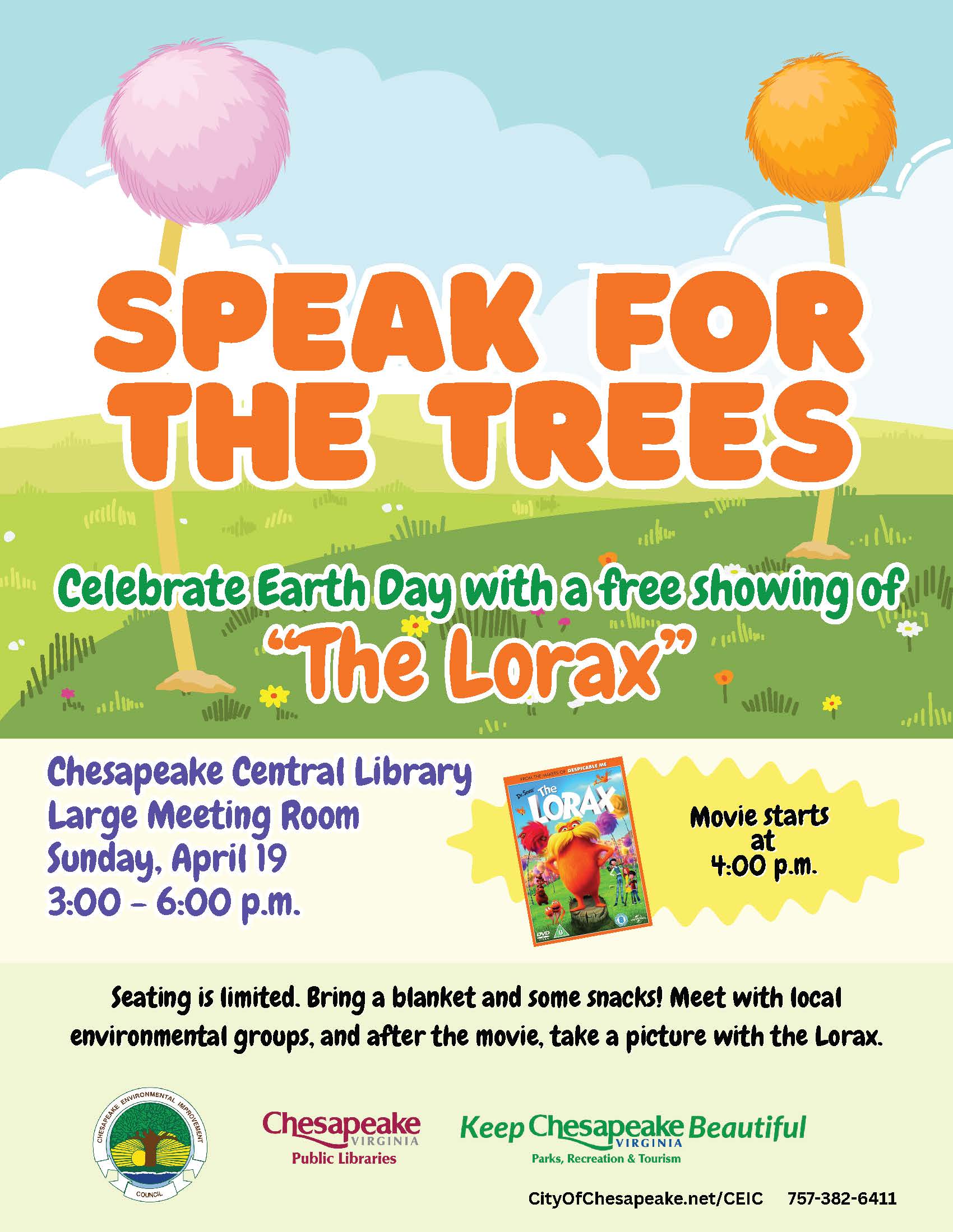 Celebrate Earth Day with a free showing of The Lorax movie. Meet with local environmental groups and take a picture with the Lorax after the movie!