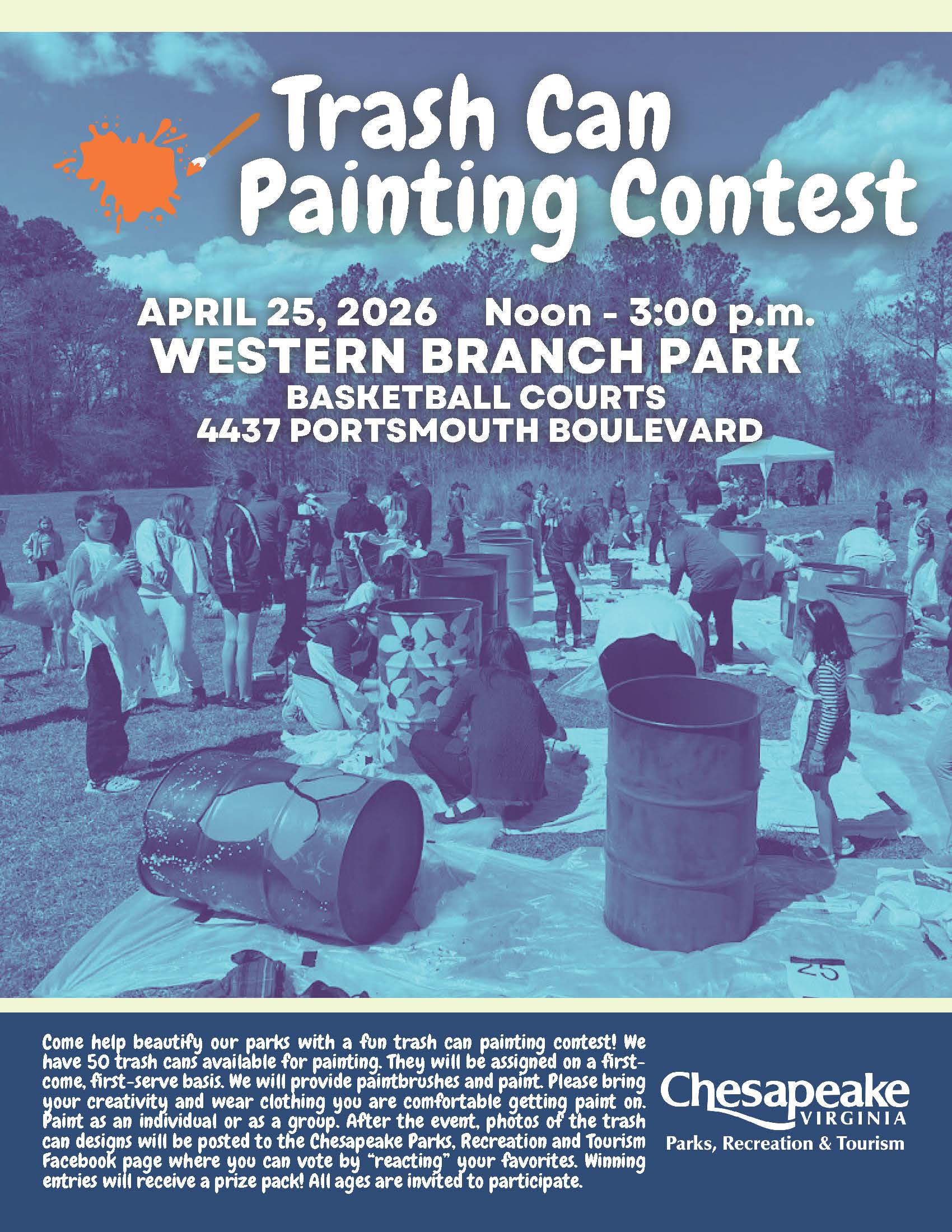 Come help beautify Chesapeake parks with a fun trash can painting contest! We have 50 trash cans available for painting. They will be assigned on a firstcome, first-serve basis. We will provide paintbrushes and paint. Please bring your creativity and wear clothing you are comfortable getting paint on. Paint as an individual or as a group. After the event, photos of the trash can designs will be posted to the Chesapeake Parks, Recreation and Tourism Facebook page where you can vote by “reacting” your favorites.